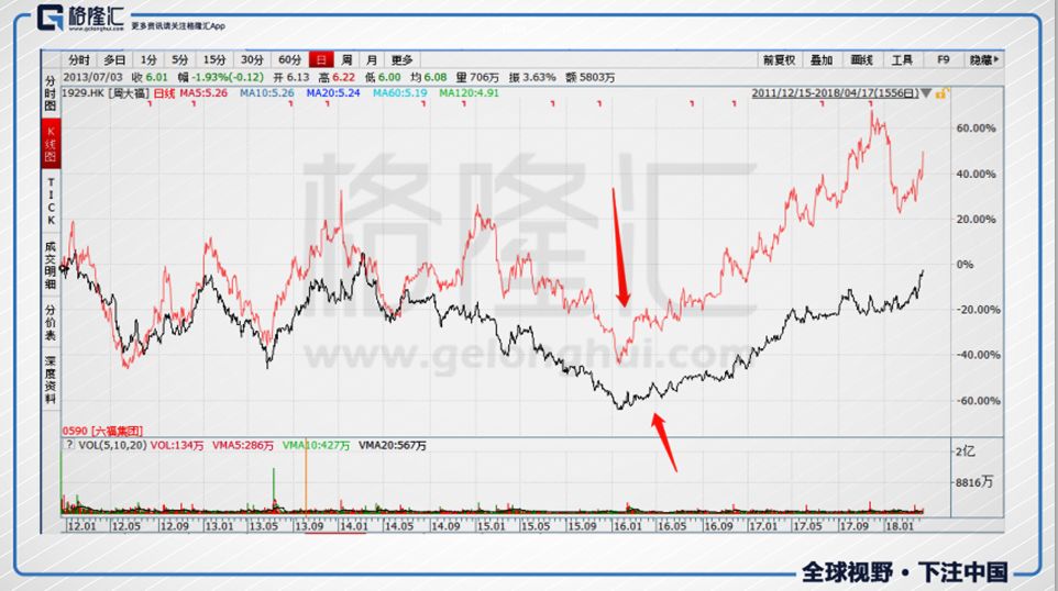 所以,就算2017財(cái)年的營業(yè)對比2016財(cái)年有輕微的下滑,但是得益于黃金的上漲,凈利潤得到改善,六福和周大福的股價(jià)也跟著黃金價(jià)格走勢漲了一波。