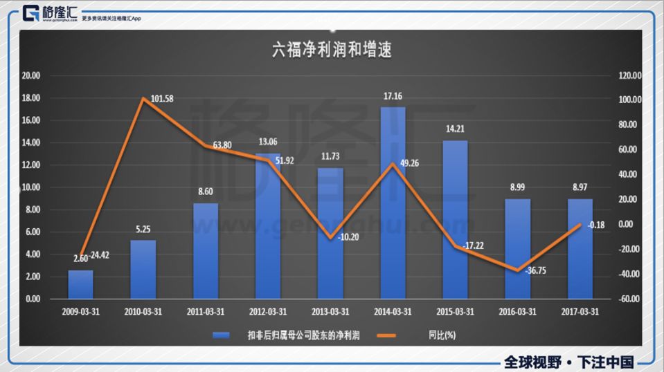 下圖是周大福以及六福的凈利潤走勢圖,仔細(xì)看,2017財(cái)年(2016年3月1日-2017年3月31日)凈利潤基本和去年持平,并沒有營業(yè)收入那樣又下滑。