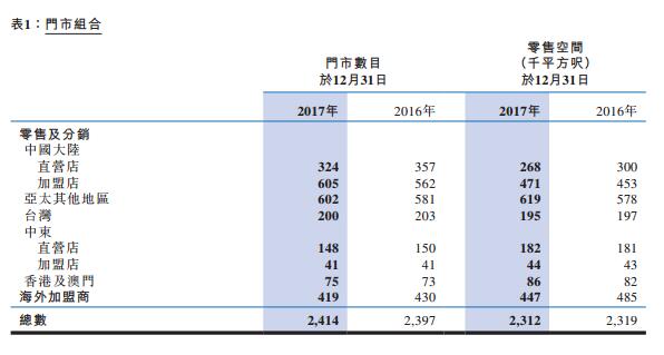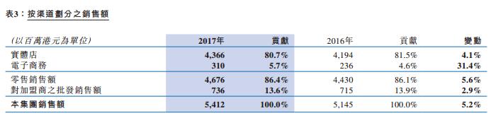 從產(chǎn)品看,核心佐丹奴品牌占總品牌銷售額的88.1%,核心女裝品牌業(yè)績顯著改善,可比門店銷售額從上半年的-0.7%提高至下半年的12.9%。全年可比較門店銷售額及可比較門市毛利分別增加5.8%及6.7%。年內(nèi)高端女裝品牌Giordano Ladies繼續(xù)擴(kuò)展,期內(nèi)擁有門店達(dá)79間門店,總銷售額達(dá)4.23億港元,較2016年的4.01億港元增加5.5%。男裝之可比門店銷售額及可比門店毛利分別增加5.8%及5.4%。此外,童裝業(yè)務(wù)增長最為強(qiáng)勁,可比門店銷售額增長16.1%,而可比門店毛利則上升19.3%。