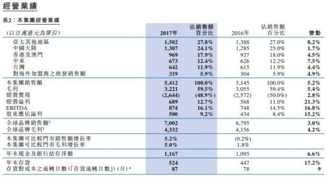 公告顯示,截止2017年12月31日,佐丹奴國(guó)際2017年度銷(xiāo)售額為54.12億港元(約43.8億元人民幣),較2016年同期增長(zhǎng)5.2%,股東應(yīng)占溢利為5.00億港元(4.04億元人民幣),較2016年增加15.2%。合并毛利率為59.5%。