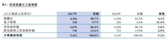 從銷(xiāo)售渠道看,實(shí)體仍然是佐丹奴的主要業(yè)務(wù),貢獻(xiàn)80.7%的銷(xiāo)售額,共43.66億港元(約35.3億元人民幣),同比增長(zhǎng)4.1%。電子商務(wù)貢獻(xiàn)銷(xiāo)售額3.1億元港元(約2.5億人民幣),占比5.7%。值得注意的是,電子商務(wù)增幅高達(dá)31.4%。
