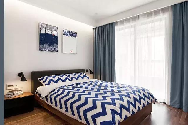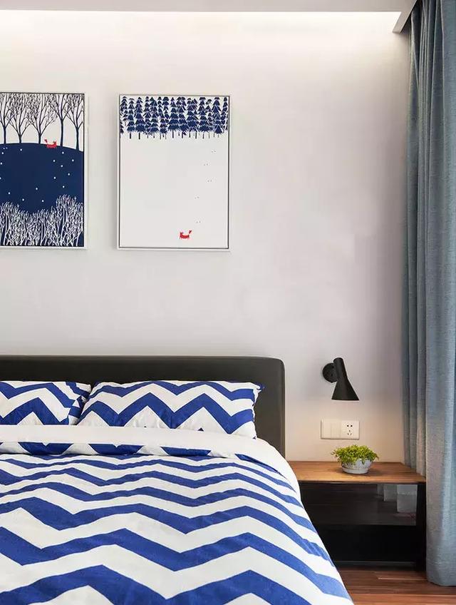 藍色線條的軟裝讓臥室別具一格,背景畫個興趣為,簡單大方的臥室,收拾的還算利落在整潔,整體感覺很好。