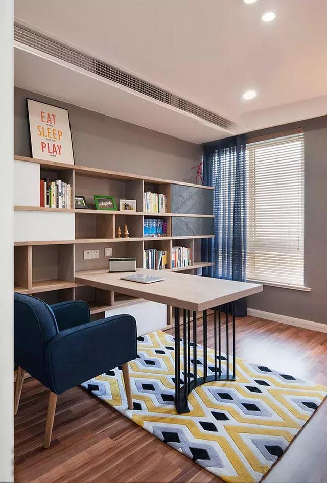 書房,用灰色作為基調(diào)色,木質(zhì)的書柜桌子,想象著陽光灑進來的時候,非常溫暖愜意了。