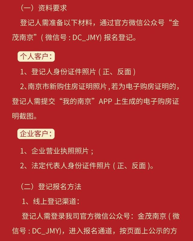 時間:6月1日早上9:00至6月2日早上9:00;關(guān)注“金茂南京”公眾號,點擊報名按鈕,按頁面上公示的內(nèi)容及規(guī)則報名。