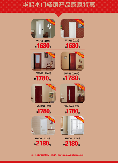 \u00A0\u00A0\u00A0\u00A0活動期間華鶴木門推出了多項優(yōu)惠措施。首先,華鶴木門推出了4大暢銷爆款產(chǎn)品,充分適應(yīng)各類裝修人群的需求,滿足家居裝修的各種風(fēng)格需要,最低僅1680元/樘。這對于一直價格相當(dāng)堅挺的華鶴木門而言,堪稱年度震撼價格,希望廣大消費(fèi)者不要錯過。其次,活動期間,全國專賣店全場產(chǎn)品超低折扣銷售,另有連環(huán)好禮等您來拿,讓廣大消費(fèi)者買的放心、買的滿意
