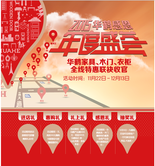 寒冬已至,各大廠商都打起精神做好年尾的收官,建材市場也不例外,實木家居老字號的華鶴集團(tuán)自1956年成立以來,深受廣大新老客戶的關(guān)注,2016年華鶴集團(tuán)更是迎來了第60個年頭,在這個伴隨著“感恩節(jié)”的深冬,華鶴集團(tuán)為回饋廣大新老客戶的支持和關(guān)注,于11月22日期至12月13日發(fā)起“年度感恩盛薈”大型主題促銷活動,華鶴集團(tuán)實木家具、衣柜、木門衣柜聯(lián)袂鉅薈,精品爆款溫情來襲,據(jù)了解很多消費(fèi)者對此次活動備受關(guān)注和期待: