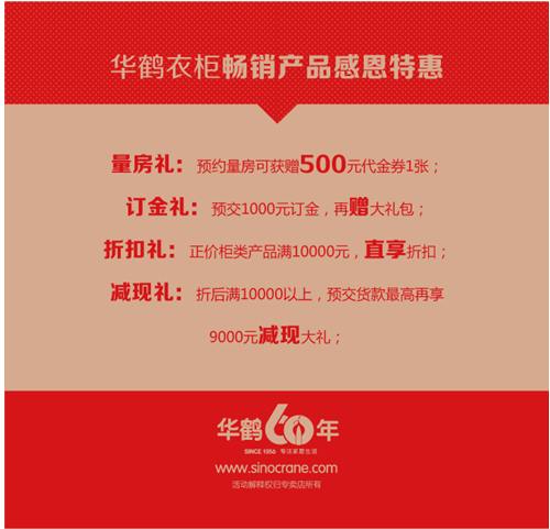 華鶴衣柜4重好禮驚喜連連 \u00A0\u00A0\u00A0\u00A0華鶴衣柜主打高端定制,外觀造型全面而細(xì)致、結(jié)構(gòu)設(shè)計專業(yè)精湛,全方位滿足中國高端消費(fèi)群體的個性化需求,是中國高端家居實木定制行業(yè)的領(lǐng)先品牌。此次活動也放下身段,回饋我們的廣大消費(fèi)者。此次華鶴衣柜推出了4重大禮。預(yù)約量房可獲500元抵扣券;預(yù)交定金再送大禮包;全線產(chǎn)品年度震撼優(yōu)惠幅度;折后還可享受預(yù)交貨款減現(xiàn)大禮。每一重大禮都充滿了驚喜,需要購買定制衣柜產(chǎn)品的消費(fèi)者一定不要錯過。
