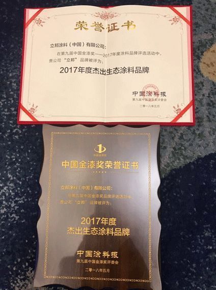 2018年5月27日,第九屆金漆獎(jiǎng)?lì)C獎(jiǎng)典禮在常州新城希爾頓酒店舉行。憑借卓越的產(chǎn)品體系和優(yōu)質(zhì)的消費(fèi)者服務(wù),立邦斬獲了“2017年度杰出工程涂料品牌” ,“2017年度杰出生態(tài)涂料品牌”,“2017年度杰出內(nèi)墻涂料品牌” ,“2017年度杰出外墻涂料品牌”和“2017年度杰出油改水戰(zhàn)略合作伙伴”五項(xiàng)大獎(jiǎng)。立邦中國區(qū)總裁鐘中林被授予“2017年度風(fēng)云人物”稱號。