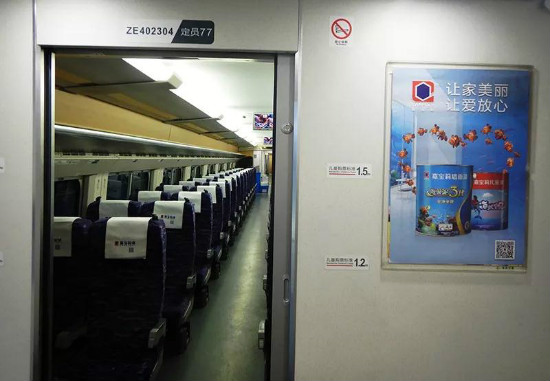 ▲高鐵車廂內嘉寶莉家具涂料桌貼廣告