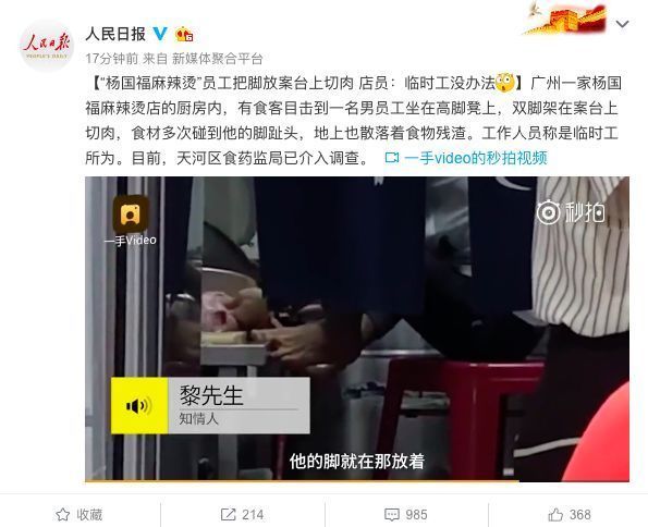 “楊國(guó)福麻辣燙”員工把腳放案臺(tái)上切肉
