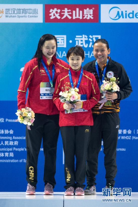 正在武漢體育中心舉行的第21屆國際泳聯(lián)跳水世界杯6日迎來第三天的賽事。在晚上進行的女子單人10米跳臺比賽中,中國小將張家齊和任茜分別獲得該項目金、銀牌。馬來西亞選手潘德莉拉獲得銅牌。