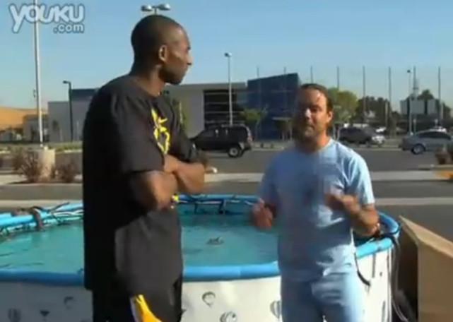 還有一個非常有名的視頻,那就是科比飛躍蛇池的扣籃。在一個露天的小型泳池里,放著很多條黑曼巴,那可是活生生的曼巴蛇,接著科比就開始了他的表演。