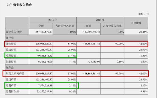 右側(cè)是長城2014年的營收,公司專一于煉焦行業(yè),但煤炭及系列產(chǎn)品不爭氣,使得營收同比下降42%。所謂窮則變,所以就有了2015年的拍板收購,于是營收中便多了游戲產(chǎn)品、動漫產(chǎn)品及動漫衍生品的收入。