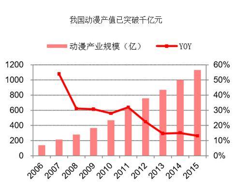進入21世紀(jì)后,國家加強了對國產(chǎn)動漫行業(yè)的扶持力度,加上互聯(lián)網(wǎng)的迅速普及,我國動漫產(chǎn)業(yè)產(chǎn)值突飛猛進,2015年我國動漫產(chǎn)業(yè)產(chǎn)值已經(jīng)突破1100億元,過去六年以16%左右的復(fù)合增速增長。