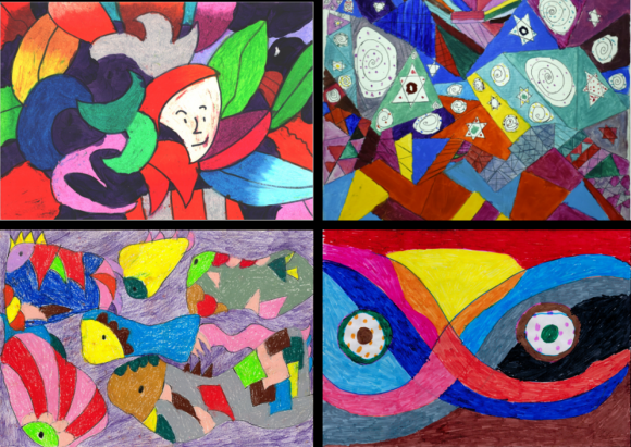 部分作品展示 左上:《葉叢與面孔》劉一, 上海 自閉癥;右上:《斑駁的星光》婷婷,成都,精神障礙 左下:《無名》 娜娜,成都,精神障礙 右下:《無名》娜娜 , 成都, 精神障礙