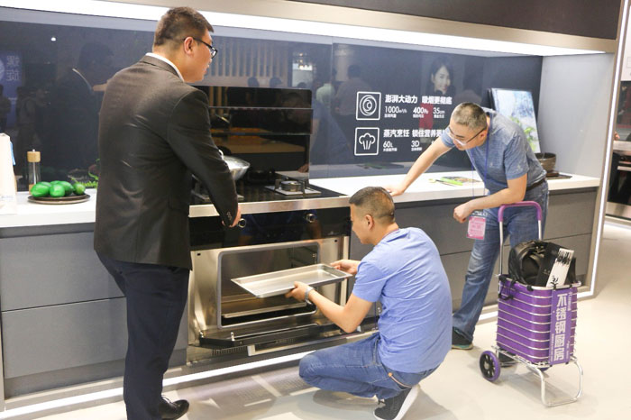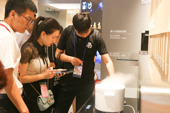 除系列明星產品,美的集成灶在新品區(qū)內為大家亮相了線下爆款、不銹鋼款、氣電兩用、蒸箱款集成灶等全新產品,尤其是煙灶蒸三位一體的美的蒸箱款集成灶,給用戶帶來更健康、更便捷的烹飪模式,許多客戶都對它表現(xiàn)出了濃厚的興趣。