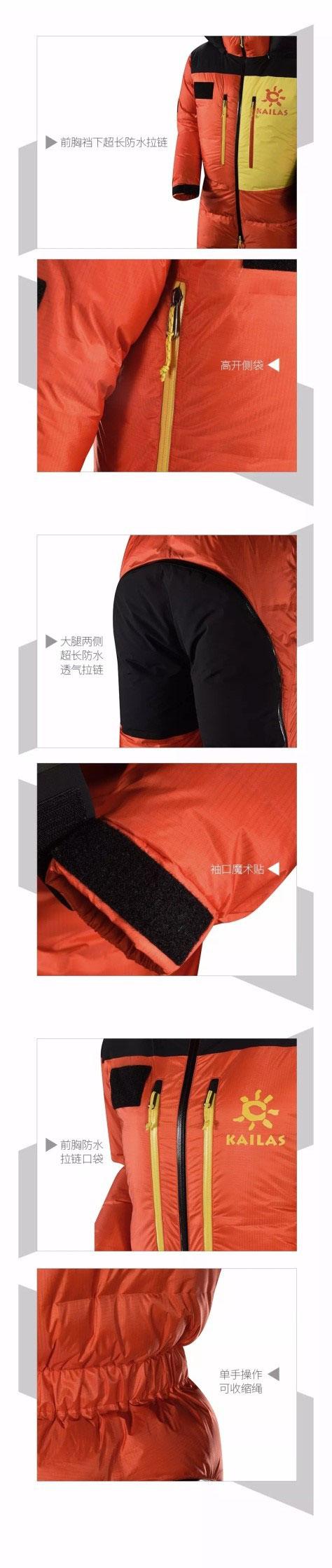 連體羽絨服外部面料為GOREWINDSTOP-PER SHELL100%Nylon,內里100%Nylon面料經過防潑水處理、防漏絨處理,覆蓋完全防風薄膜,無死角防風保護,減少寒風暴雪對體溫的影響。內部填充850pro防水鵝絨,內部填充的防水羽絨,作為最后一層屏障,基本上杜絕了暴雪浸濕羽絨服的可能,在保證足夠充絨量的基礎上,雖然看上去厚厚一件,但其實一點都不壓身;雖然有多重防水防風保護,但絕不用擔心悶熱,汗氣可輕易從高度透氣的薄膜釋放,從而減少過熱和濕氣的集結。并采用BODY MAP人體圖譜技術,專業(yè)高海拔技術型剪裁設計,適用于極地環(huán)境的如廁需求。
