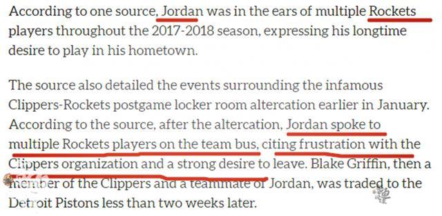 據(jù)美媒記者Kelly Iko報(bào)道,NBA快船隊(duì)球星德安德烈-喬丹,他現(xiàn)在依舊想前往家鄉(xiāng)休斯頓打球,而據(jù)消息人士透露,在2018年1月16日火箭隊(duì)和快船隊(duì)球員沖突事件之后,小喬丹就和多位火箭隊(duì)球員談到自己對(duì)快船隊(duì)的失望以及有意離開(kāi)的想法...
