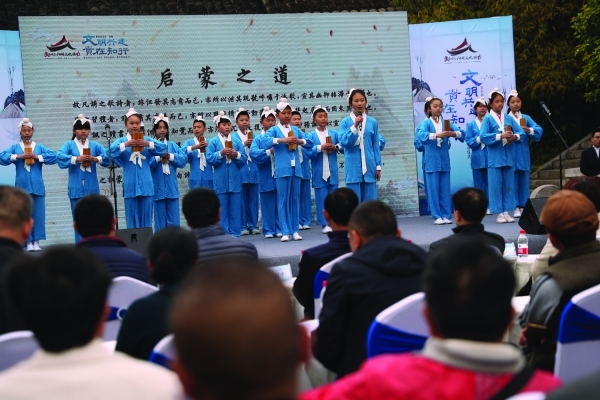 2018云巖區(qū)“良知行·陽明文化接力”系列活動(dòng)啟動(dòng)儀式上,東山小學(xué)的同學(xué)吟誦《啟蒙之道》。通訊員 鐘關(guān)勇 攝