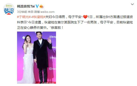 6月1日消息,據(jù)韓媒報(bào)道,演員于曉光的韓籍演員妻子秋瓷炫所屬社BH方面通過報(bào)道資料表示“今日凌晨,秋瓷炫在首爾某醫(yī)院生下了一名男孩,母子平安,目前秋瓷炫正在安心靜養(yǎng)恢復(fù)中!
