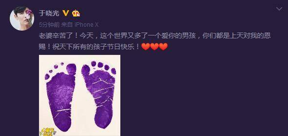 隨后,秋瓷炫的老公于曉光曬出兒子小腳丫印出的照片,還感謝妻子:“老婆辛苦了!今天,這個(gè)世界又多了一個(gè)愛你的男孩,你們都是上天對我的恩賜!祝天下所有的孩子節(jié)日快樂!”網(wǎng)友紛紛送出祝福。