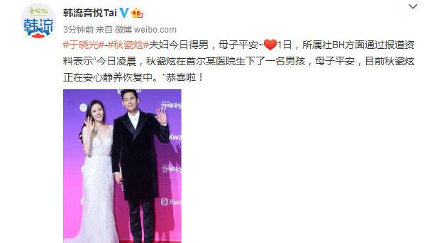 6月1日消息,據(jù)報(bào)道,演員于曉光的韓籍演員妻子秋瓷炫所屬社BH方面通過報(bào)道資料表示“今日凌晨,秋瓷炫在首爾某醫(yī)院生下了一名男孩,母子平安,目前秋瓷炫正在安心靜養(yǎng)恢復(fù)中。”