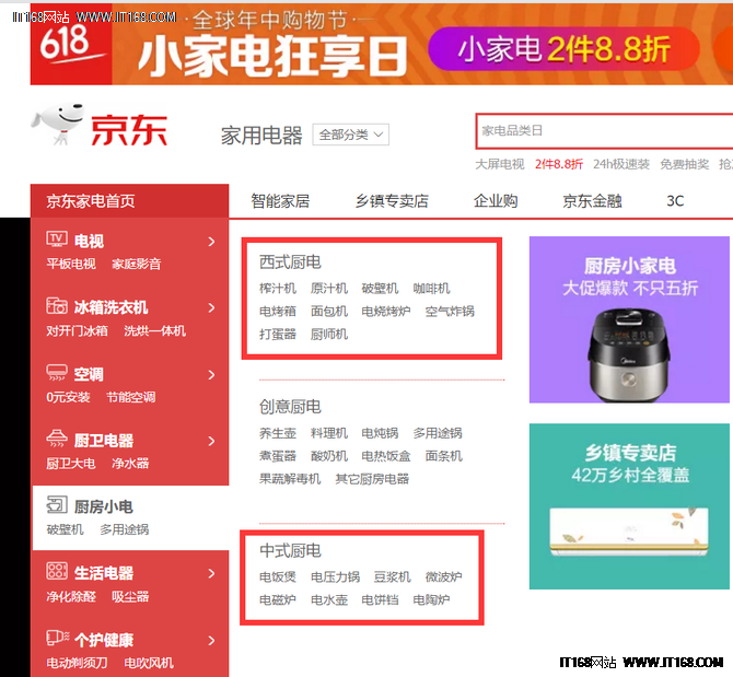 而且今年618排行榜相比去年有了新變化,在1個(gè)全品類銷售額總榜之外的15個(gè)分項(xiàng)榜單中有兩項(xiàng)都是關(guān)于廚電的,細(xì)分為中式廚電和西式廚電。當(dāng)我們打開京東商城的家電網(wǎng)頁(yè)時(shí),也會(huì)發(fā)現(xiàn),廚電細(xì)分為西式廚電和中式廚電。