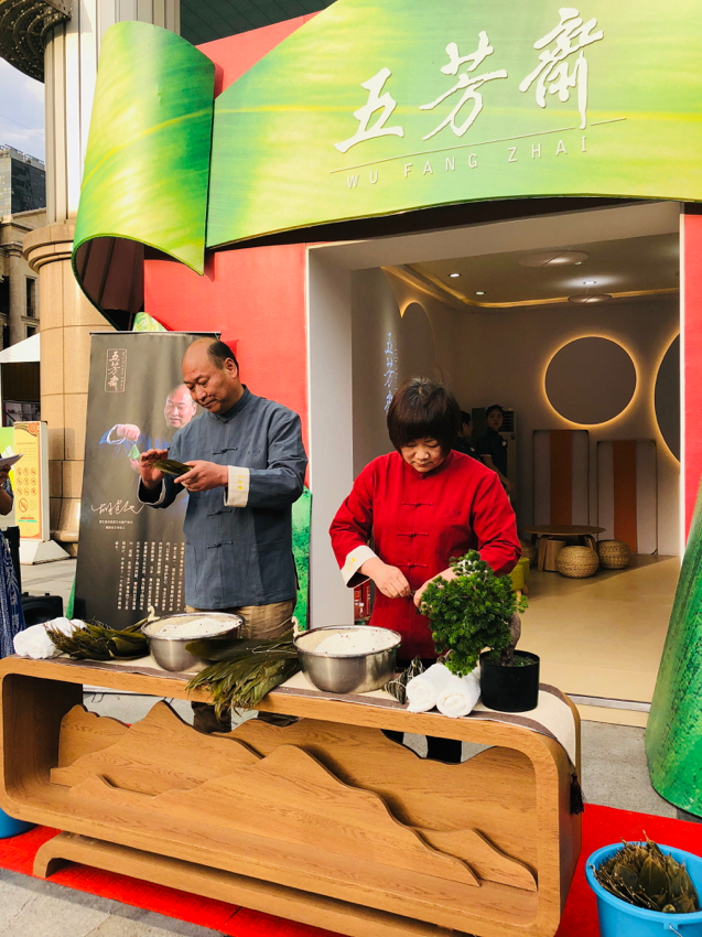 現(xiàn)場(chǎng)邀請(qǐng)了”五芳齋粽子制作技藝“浙江省非遺傳承人胡建民與嘉興市非遺傳承人郁影萍,兩位大師親臨現(xiàn)場(chǎng)進(jìn)行裹粽表演,教授裹粽技巧,吸引了眾多圍觀群眾爭(zhēng)相學(xué)習(xí)裹粽子。