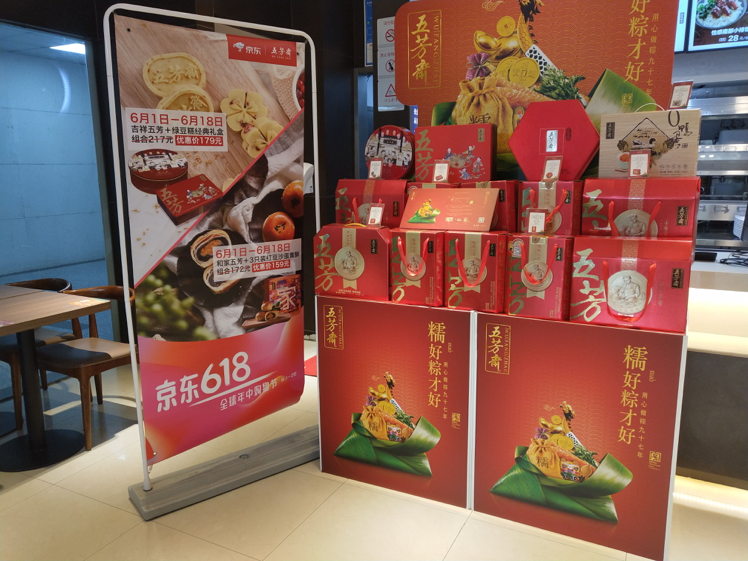 這個(gè)端午季,五芳齋在全國(guó)300+門店,通過(guò)采取店面外易拉寶、店內(nèi)海報(bào)、店內(nèi)電子屏幕廣告展示方式,參與到京東618無(wú)界零售的項(xiàng)目中,和京東端午文化節(jié)做線上線下聯(lián)動(dòng)。買粽子上京東超市,各種高端禮盒火熱銷售中!