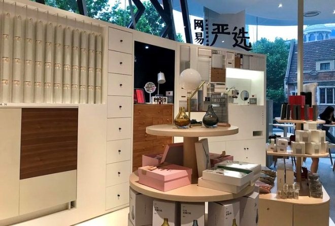 這家咖啡館二樓有一個(gè)網(wǎng)易嚴(yán)選的“無人貨架”,出售筆記本、LED鏡子和水壺等產(chǎn)品。這是網(wǎng)易嚴(yán)選和百勝合作設(shè)立的。這片區(qū)域旁邊有肯德基的店員看著產(chǎn)品,指導(dǎo)消費(fèi)者使用自動(dòng)結(jié)賬機(jī)器。