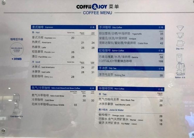 如果你問 COFFii & JOY 店員有何推薦的,他們會(huì)告訴你這家店主打手沖。和許多精品咖啡店一樣,這家店設(shè)有手沖壺和虹吸壺的臺(tái)面。除開手沖和虹吸咖啡, COFFii & JOY 的價(jià)格比星巴克略低一點(diǎn)。不過,其中一款據(jù)說是每天限量 10 杯的“COFFii & JOY 限量臻選咖啡”價(jià)格高達(dá) 199 元一杯。