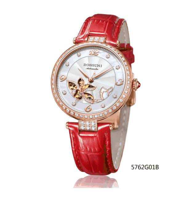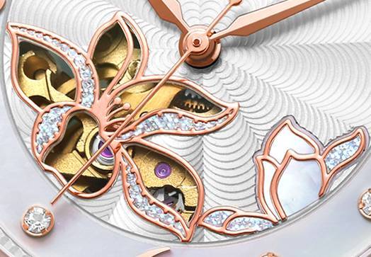 5762腕表鏤空的花瓣下,機械機心的美感“韻”作一覽無余,日夜唱響女性專屬的時光之曲;ò赀吘壯b飾的鉆石與表盤外圈和4點位花瓣的珍珠貝母交相輝映,顯露精致。