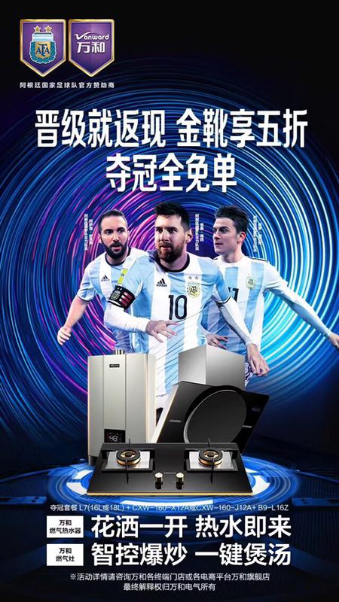 從萬和下發(fā)的營銷文件了解到,萬和參與世界杯主題促銷的產(chǎn)品超過50款,價(jià)格段從999-14999元均涵蓋,并且還為消費(fèi)者設(shè)計(jì)了世界杯主題活動的盛宴產(chǎn)品,通過直接讓利的形式進(jìn)行銷售,最大讓利幅度超過1000元,其產(chǎn)品數(shù)量、價(jià)格段豐富度和基礎(chǔ)讓利折扣占有明顯優(yōu)勢;活動時(shí)間則從6月8日持續(xù)到7月4日,跨度時(shí)間也是最長的,且線上、線下和官方商城力度同步。其中針對萬和指定機(jī)型(奪冠套餐和金靴單品),消費(fèi)者可以參與阿根廷“晉級就返現(xiàn)、金靴享五折、奪冠全免單”的活動,一旦阿根廷表現(xiàn)出色,消費(fèi)者將得到更多額外的福利回報(bào)。