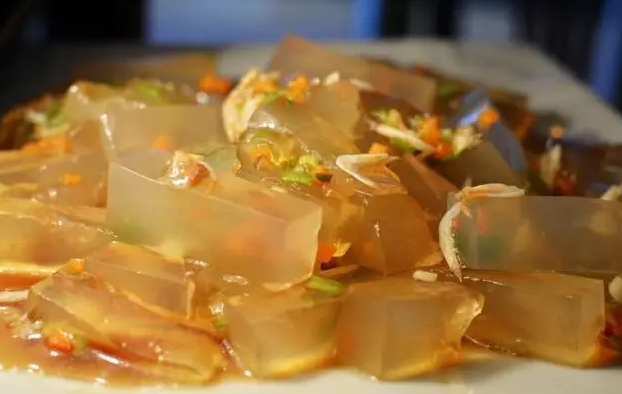 又叫青島涼粉,青島著名的十大小吃之一,幾乎每一個(gè)土生土長(zhǎng)的青島人都會(huì)做。青島涼粉以青島獨(dú)有的一種海菜——石花菜為主要原料熬制而成,透明晶瑩,加上蒜泥、香菜末、香油、醋、鹽、味精等,爽滑又美味,是夏天青島市民最佳的解暑佐酒佳肴。