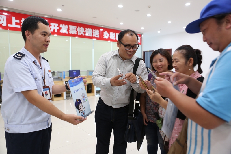 圖為:稅務(wù)人員向臺灣同胞介紹網(wǎng)上辦稅情況