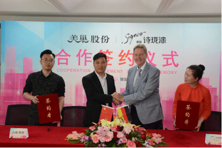 近日,Signeo德國詩瓏漆與美巢股份集團(tuán)在鄭州簽署戰(zhàn)略合作協(xié)議,J.W.O集團(tuán)國際業(yè)務(wù)總裁Signeo德國詩瓏漆海外技術(shù)總監(jiān)漢斯博士(Dr. Hans)、美巢股份高端聆海設(shè)計(jì)公司總經(jīng)理劉亮分別代表雙方進(jìn)行簽約。雙方將以為消費(fèi)者提供環(huán)保、安全的高端家裝體驗(yàn)為己任,全面提升河南家裝市場質(zhì)量,更好的服務(wù)于鄭州乃至整個中原市場。