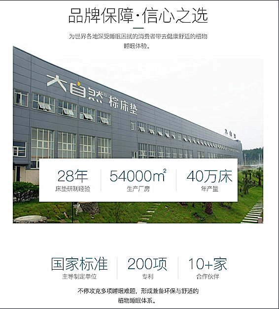 28年來(lái),大自然始終保持著對(duì)棕床墊的初心與匠心,每一張床墊都凝聚著天然原料與科技智慧的結(jié)晶,都是中華民族的偉大創(chuàng)造與中國(guó)睡眠文化的傳承。大自然棕床墊作為富有中國(guó)特色的健康產(chǎn)品,對(duì)于重建我們的品牌自信、文化自信具有長(zhǎng)遠(yuǎn)的意義,它濃縮了中國(guó)文化與智慧,重建了中國(guó)睡眠文化,也孕育出了“托起中國(guó)的脊梁”這一全新的品牌形象。大自然棕床墊,托起的是品牌自信的脊梁,是13億中國(guó)人的脊梁,也是睡眠文化復(fù)興的脊梁。”大自然夢(mèng)中國(guó)“,“中國(guó)創(chuàng)造,中國(guó)睡眠”,讓源于中國(guó)的睡眠方式,創(chuàng)造中國(guó)的睡眠品牌,以大自然的力量托起中國(guó)的脊梁,撐起我們每一個(gè)美夢(mèng)。