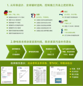 東易日盛家裝黑科技——靜電粉末噴涂技術(shù),開啟家裝行業(yè)新格局,將設(shè)計帶進(jìn)入定制時代。經(jīng)權(quán)威機(jī)構(gòu)檢測,東易日盛基于靜電粉末噴涂技術(shù)的無毒定制家裝產(chǎn)品,未檢測出甲醛、苯、甲苯等VOC及重金屬。