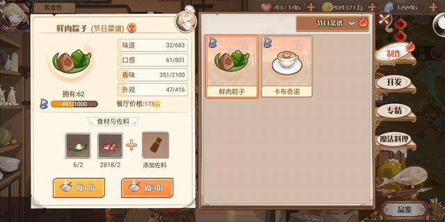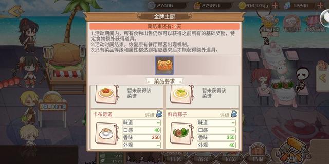 活動期間,餐廳的節(jié)日菜譜有茄汁意面、薄荷菠蘿、卡布奇諾、鮮肉粽子四大種,它們?nèi)繉儆谑涞牟讼怠Ec其它兩大菜系不同的是,御侍大人只有達到要求的等級后,通過完成的失落的菜譜系列任務(wù)才能解鎖這些菜譜。