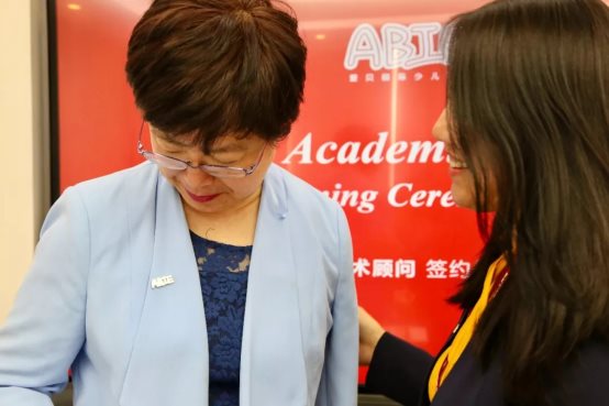 愛貝國(guó)際少兒英語總部副總裁柴麗娜女士代表愛貝為Ann Chan女士頒發(fā)學(xué)術(shù)顧問聘書,愛貝國(guó)際少兒英語總部學(xué)術(shù)研發(fā)總監(jiān)吳瑕女士也現(xiàn)場(chǎng)出席受聘儀式。
