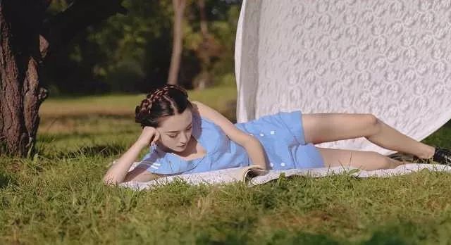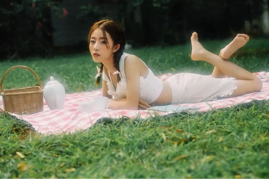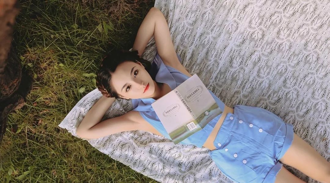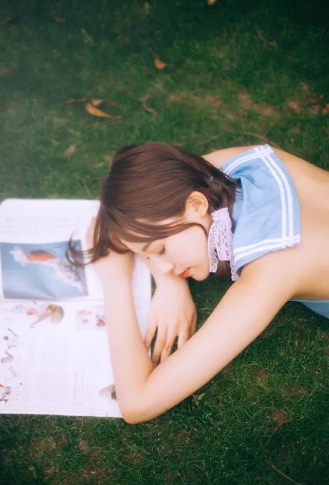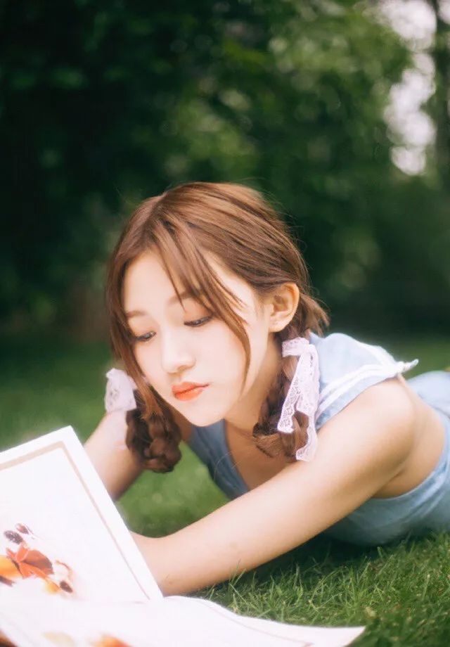 女孩趴在水花飛濺的草坪上沐浴著陽光讀著書