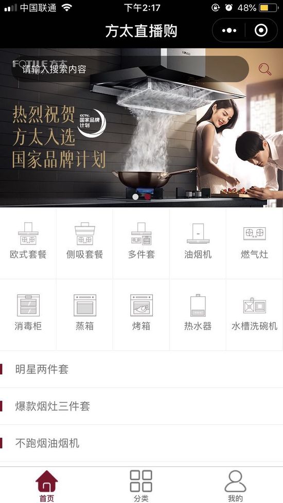 而在方太直播購小程序上,在售品類包括:油煙機、燃氣灶、消毒柜、蒸箱、烤箱、熱水器以及水槽洗碗機等。并且,還有多種搭配套餐購買選擇:歐式套裝、側(cè)吸套裝、明星兩件套、爆款煙灶三件套等。