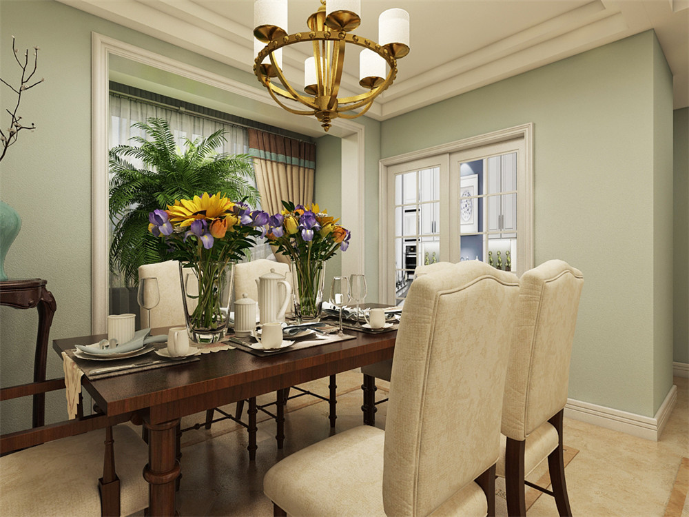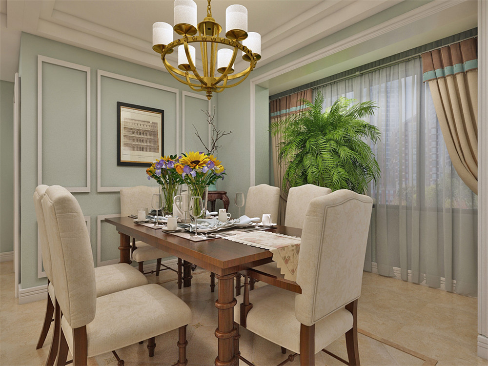 \u00A0餐廳與客廳整體相呼應(yīng),餐廳簡潔明快,色調(diào)與客廳一致,簡單的裝飾畫凸顯氛圍,餐桌的實(shí)木跟家具一致,窗簾等配飾的采用,營造出溫馨的氛圍。