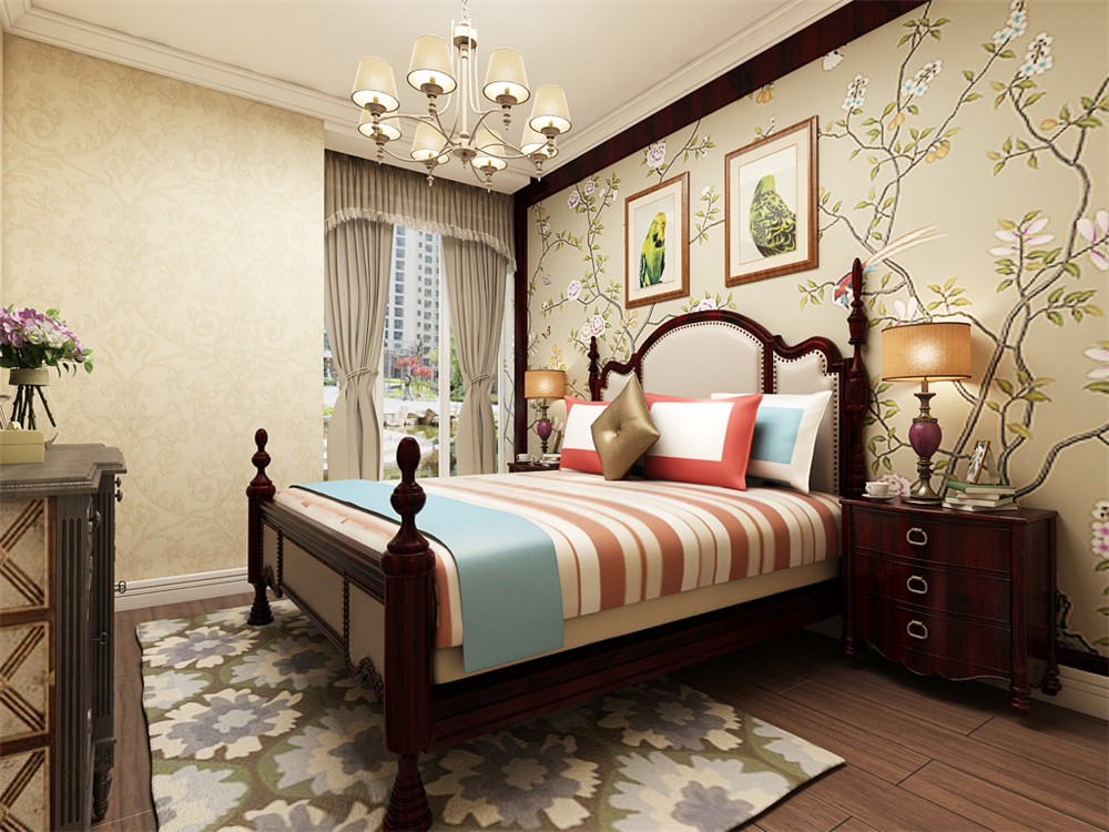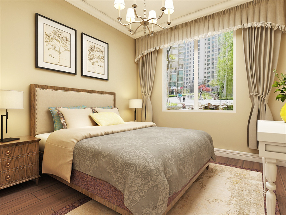 主臥布置溫馨,美式家居的布置較為溫馨,作為主人的私密空間,主要以功能性和實(shí)用性為重點(diǎn),壁紙和窗簾等裝飾上用色統(tǒng)一。