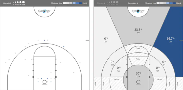 他兼具出色的身體條件和優(yōu)秀的投籃手感,具有成為優(yōu)質(zhì)翼側(cè)得分手的潛質(zhì)。他投籃出手點(diǎn)很高,不過(guò)投籃命中率有些起伏。他生涯早期投籃數(shù)據(jù)很漂亮,但在大學(xué)三分球10投3中,平均每次接球跳投僅0.692分。