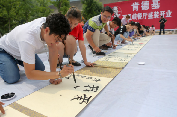 據(jù)了解,這個(gè)“百尺長卷”是肯德基“向傳統(tǒng)致敬”的一個(gè)創(chuàng)意,取“天時(shí)”(端午傳統(tǒng)節(jié)日開業(yè))、“地利”(古意盎然的百里峽景區(qū)和仿古建筑的餐廳)、“人和”(游客用毛筆在宣紙長卷上題字)之意,可謂別具匠心,用意深遠(yuǎn)。