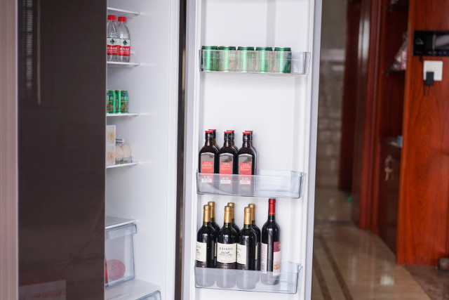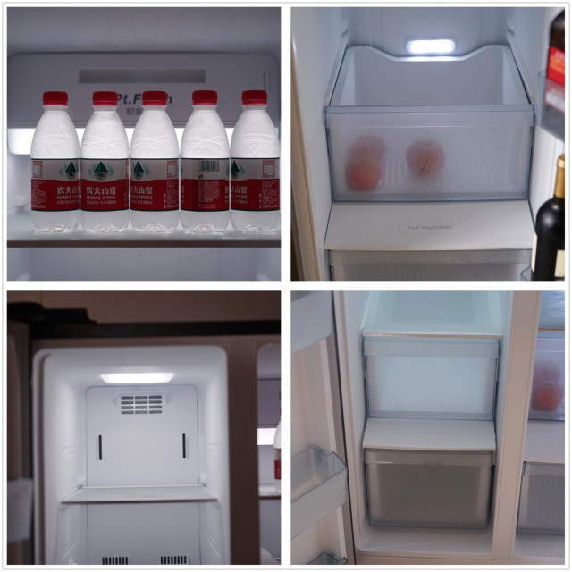 看完外觀看下內(nèi)部空間情況,這也是這款冰箱非常值得肯定的地方,空間利用率很高,收納空間的分布也是較為合理,隔板部分可以根據(jù)使用情況合理調(diào)整。冷藏及冷凍門上面分別設(shè)置了五個托盤,不同間隔的設(shè)計也方便收納不同高度的食品、飲料,冷藏門上同托盤空間比樓主現(xiàn)在用的大了不少,并排放兩瓶紅酒都有富裕。