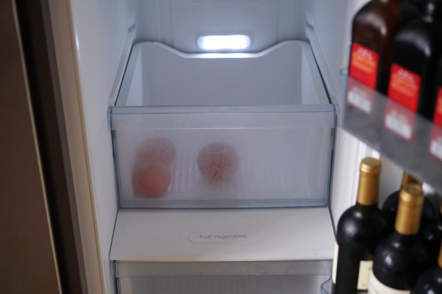位于冷藏式底部的果菜盒及冷凍室的抽屜,可以發(fā)現(xiàn)雖然采用的是對開門設(shè)計,但是在內(nèi)部還是進(jìn)行的有效規(guī)劃,抽屜的加入也方便盛放各種零散的食材,特別是冷藏室,果菜類食材不可避免的會有水份析出,抽屜的形式更有利于同類食材的收納。