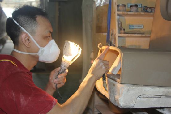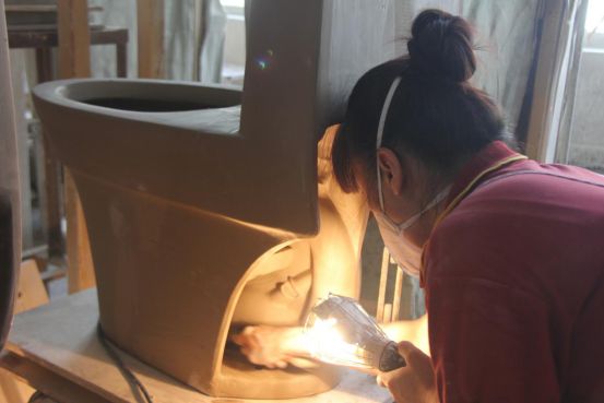 馬桶坯體剛從模具中拿出來還是一個(gè)“粗坯”,會(huì)有很多邊角、模具吸附的痕跡等,需要經(jīng)過人工的檢查、打磨和修飾才能成為一個(gè)平整光潔、圓潤(rùn)無暇的坯體。修坯的工作是最辛苦的,不僅要考驗(yàn)技巧、手穩(wěn),還需要很大的耐心和毅力。因?yàn)榻鹋菩l(wèi)浴的質(zhì)控標(biāo)準(zhǔn)比較嚴(yán)格,不容許有一點(diǎn)瑕疵,所以每個(gè)坯體都要經(jīng)過十幾次的檢查和打磨修飾。打著燈泡來找茬是發(fā)現(xiàn)細(xì)微瑕疵的有效方法,但是大功率的燈泡也帶來了高溫,讓周華飛滿頭的汗水更加密集。