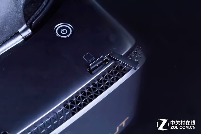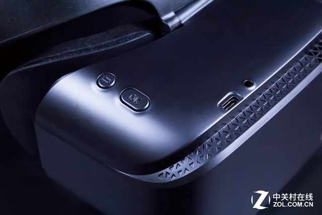 iQUT未來影院的頭顯部分較為圓潤,設(shè)計非常簡潔,其主要的按鍵和接口都在機(jī)身頂部。從機(jī)身頂部看,其左側(cè)為電源鍵和TF卡槽,右側(cè)則是確認(rèn)鍵、返回鍵、3.5mm耳機(jī)口以及USBType-C接口。機(jī)身正面與頂部、底部之間則采用了階梯狀過渡設(shè)計,并開有小孔以便散熱。此外,在頭顯的左側(cè),還印有愛奇藝的logo。